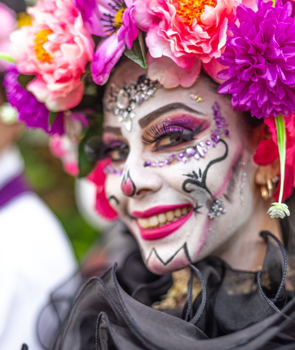 Makeup ready! Let your hair loose or braid it, then put on a hat or make a floral crown … there are many options and you can do them yourself very easily. We prefer a crown and a white dress, but a black suit or dress can also look amazing. Now you’re perfect to go to the traditional Parade of the Souls on the Day of the Dead.