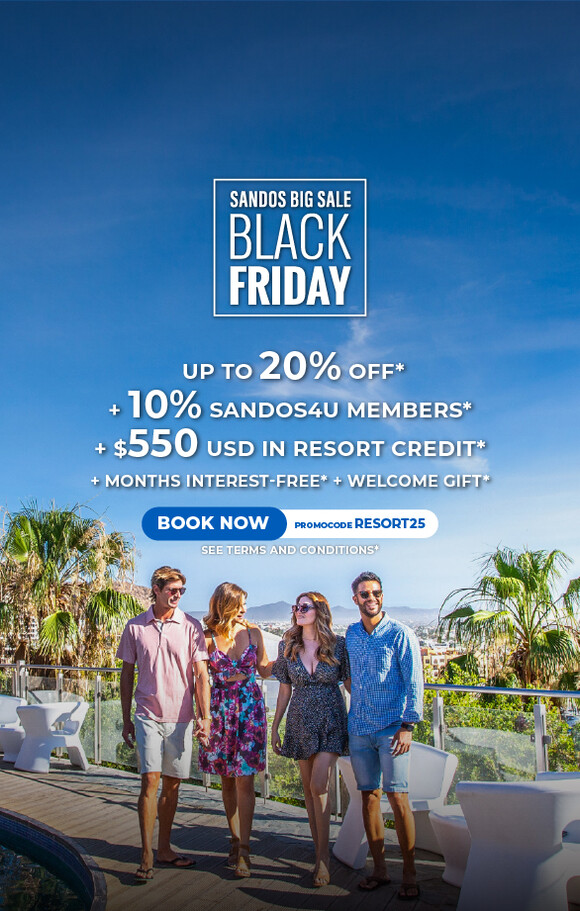 Experience the beauty of the Pacific during our Black Friday Sale! Enjoy stunning views, adventure, and relaxation in one of Los Cabos’ most iconic resorts. Get up to 20% off + 10% extra Sandos4U, $550 USD Resort Credit, interest-free months, and a welcome gift. Book with promocode RESORT25 before December 2, 2025.