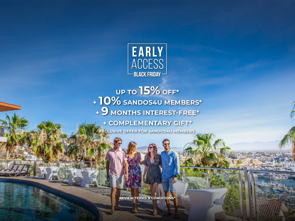 Make the most of our Early Access Black Friday deal and get up to 15% off + an extra 10% for Sandos4U members, 9-month interest-free payments, and a special courtesy gift. Book from October 27 to November 2, 2025, and travel between October 27, 2025, and December 31, 2026. Enjoy breathtaking views of the Pacific Ocean and Cabo San Lucas marina at Sandos Finisterra.