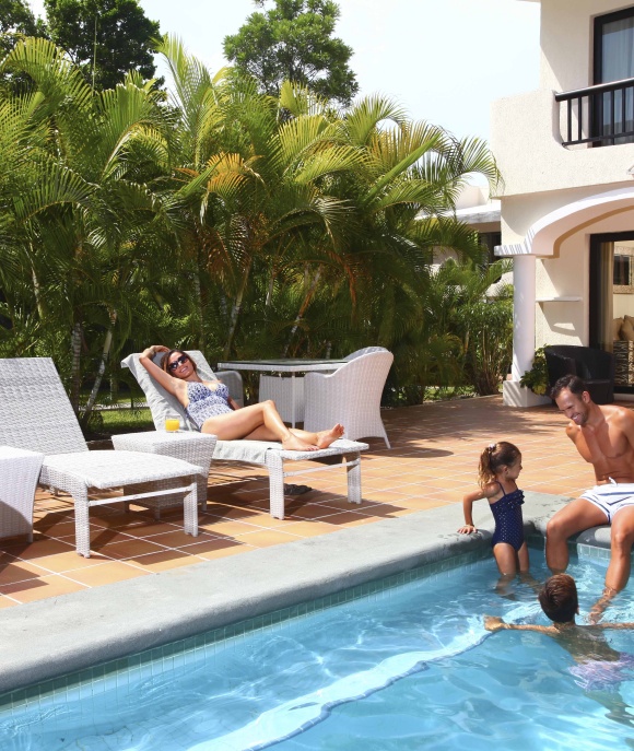 As soon as you open the door to the Hacienda Junior Suite, you’ll know you made the right choice. The highlights of these suites include access to an exclusive plunge pool + Jacuzzi, private balcony, integrated living area, free Wi-Fi, and a spacious bathroom with stylish walk-in shower. The Hacienda Junior Suites comfortably sleep 2 adults and 3 children and are just a short walk away from the beach and main pool area.
